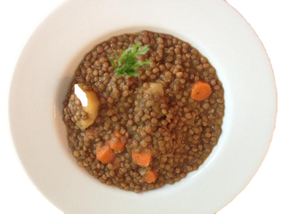 Now we add the puree to the a pot, add the lentils. We mix it well so that all the flavors are integrated. Cook for four minutes over low heat and cover the pot with water or chicken broth We slow boil and cook until the lentils are tender.